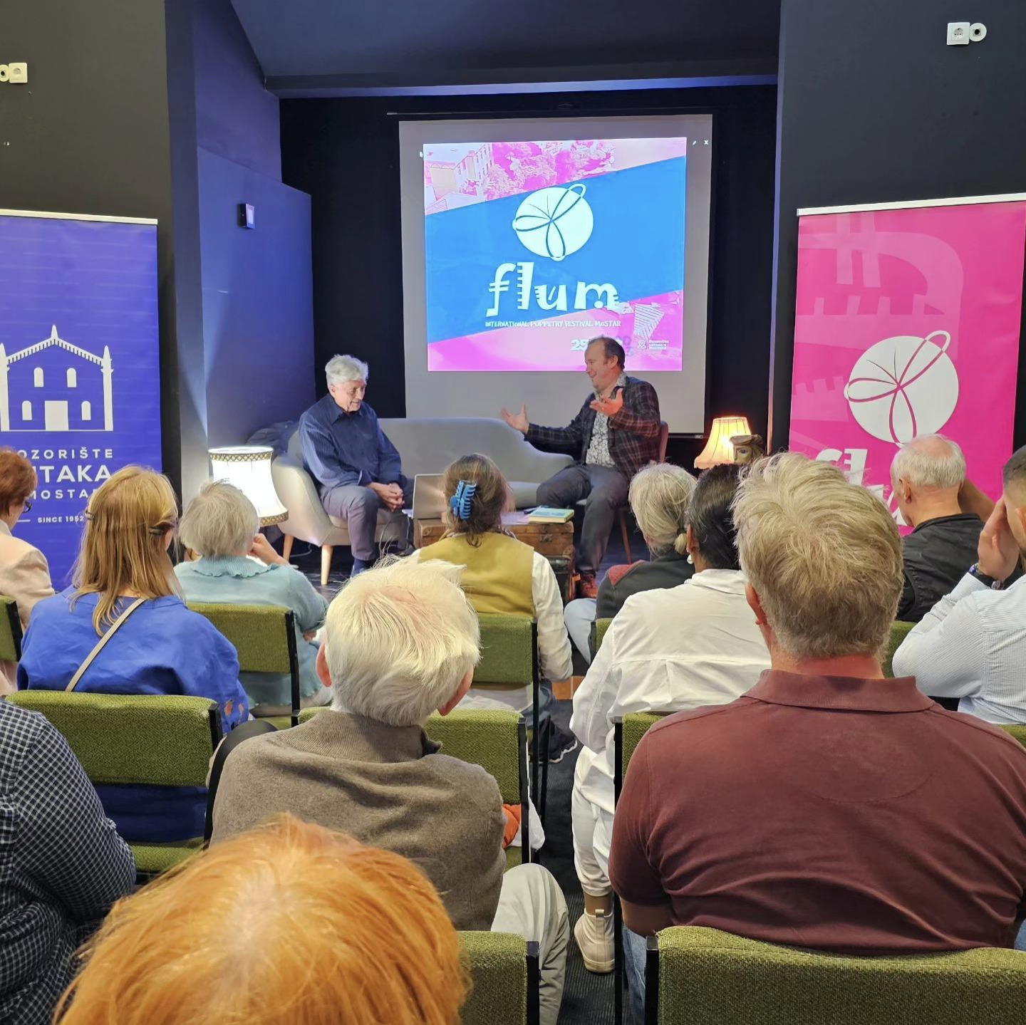 Representantes de diferentes naciones se congregaron en Mostar para el Festival FLUM, creando una vibrante mezcla de culturas y tradiciones. El primer evento fue «Conversación con el Sr. Edi Majaron», que abordó el tema del diseño y la tecnología en la marioneta y ofreció una breve mirada a la historia del trabajo de Majaron tanto en Mostar como a nivel internacional. Edi Majaron fue un renombrado director de marionetas esloveno y exmiembro del Comité Ejecutivo de UNIMA, lo que lo convierte en una de las figuras más influyentes en el arte de la marioneta a nivel mundial. Su impresionante carrera y trabajo han dejado una marca perdurable en la historia del arte y de UNIMA, ya que fue un miembro de larga trayectoria en el Comité Ejecutivo.