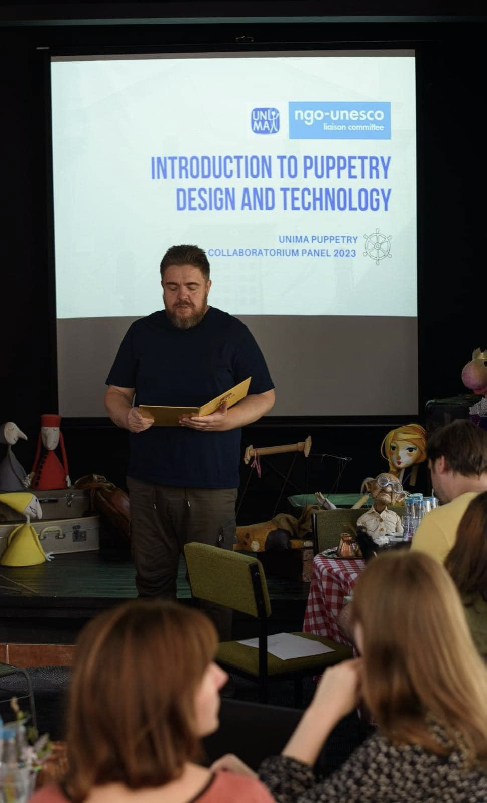 También es importante destacar que el UNIMA Collaboratorium de Títeres tuvo el honor de contar con la presencia de representantes de UNIMA Ucrania de la Universidad Nacional Karpenko-Kary de Teatro y Televisión, incluyendo a los profesores el Sr. Mykhailo Urytsky y la Sra. Mariia Pohrebniak, junto con su estudiante, la Sra. Oleksandra Filonenko. A pesar del conflicto en curso en Ucrania, su participación refleja un compromiso compartido con un mundo mejor y más pacífico para nuestros niños, familias y amigos.
