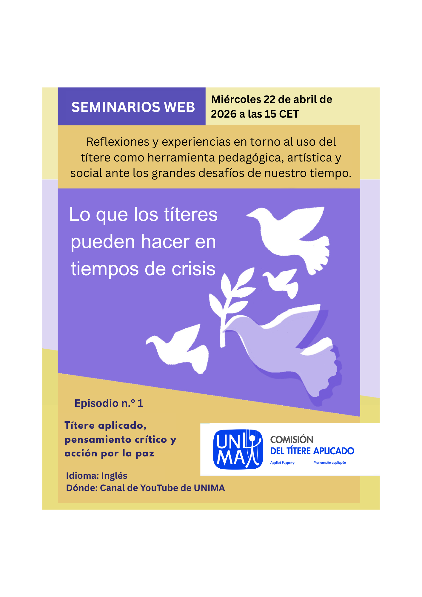 La Comisión de Títeres Aplicados anuncia el próximo seminario web Títeres aplicados: pensamiento crítico y acción para la paz, un evento internacional en línea dedicado a explorar los títeres como herramienta pedagógica, artística y social frente a los desafíos globales contemporáneos.